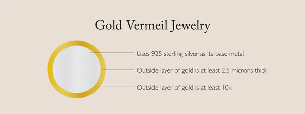 Gold Layer: To be considered vermeil, the jewelry must have a thicker gold coating than standard gold plating. The gold layer must be at least 2.5 microns thick and made from gold of at least 10k purity (though 14k or 18k gold is more common).