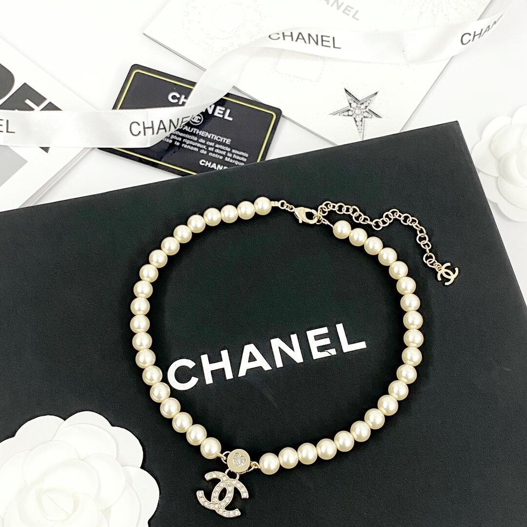 CCN551 24B Rhinestone cc logo pearl choker necklace