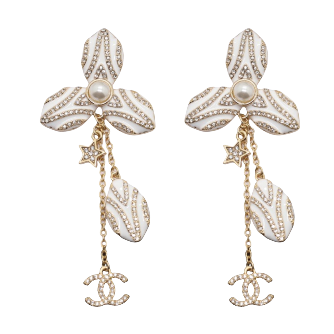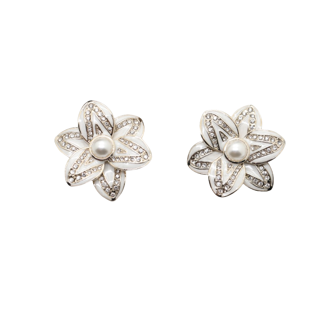 CCE327 Chanel white enamel and crystal flower earrings
