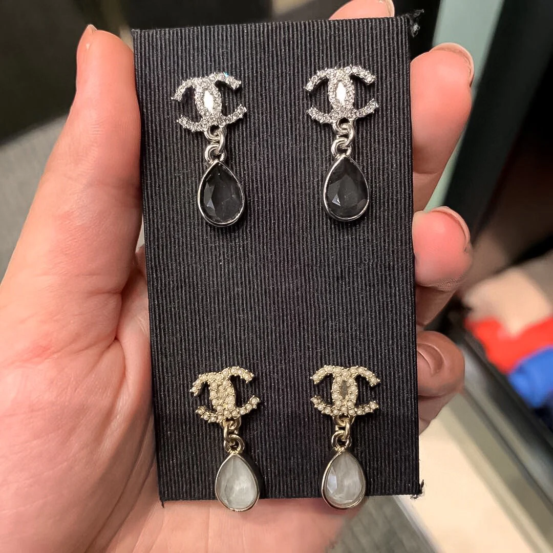 CCE567 Metal chain with multicolor crystal pearl cc logo stud earrings