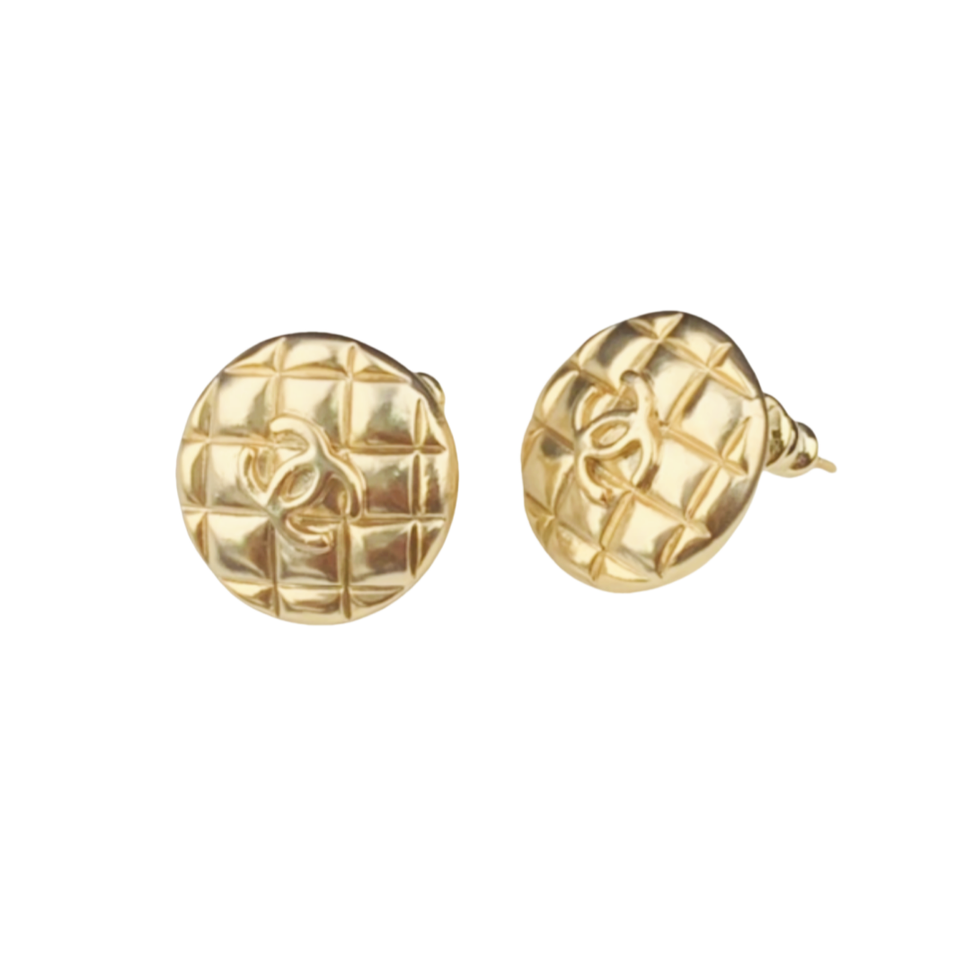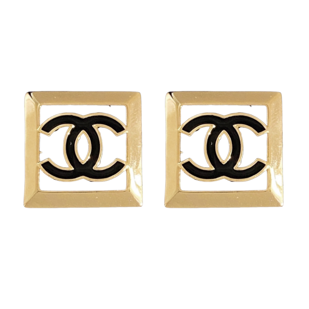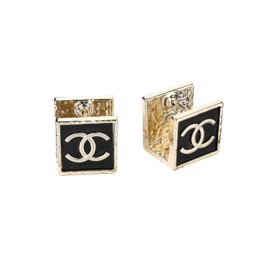 CCE347 Chanel Vintage Metal Square Black Leather-Like Minimalist Earrings