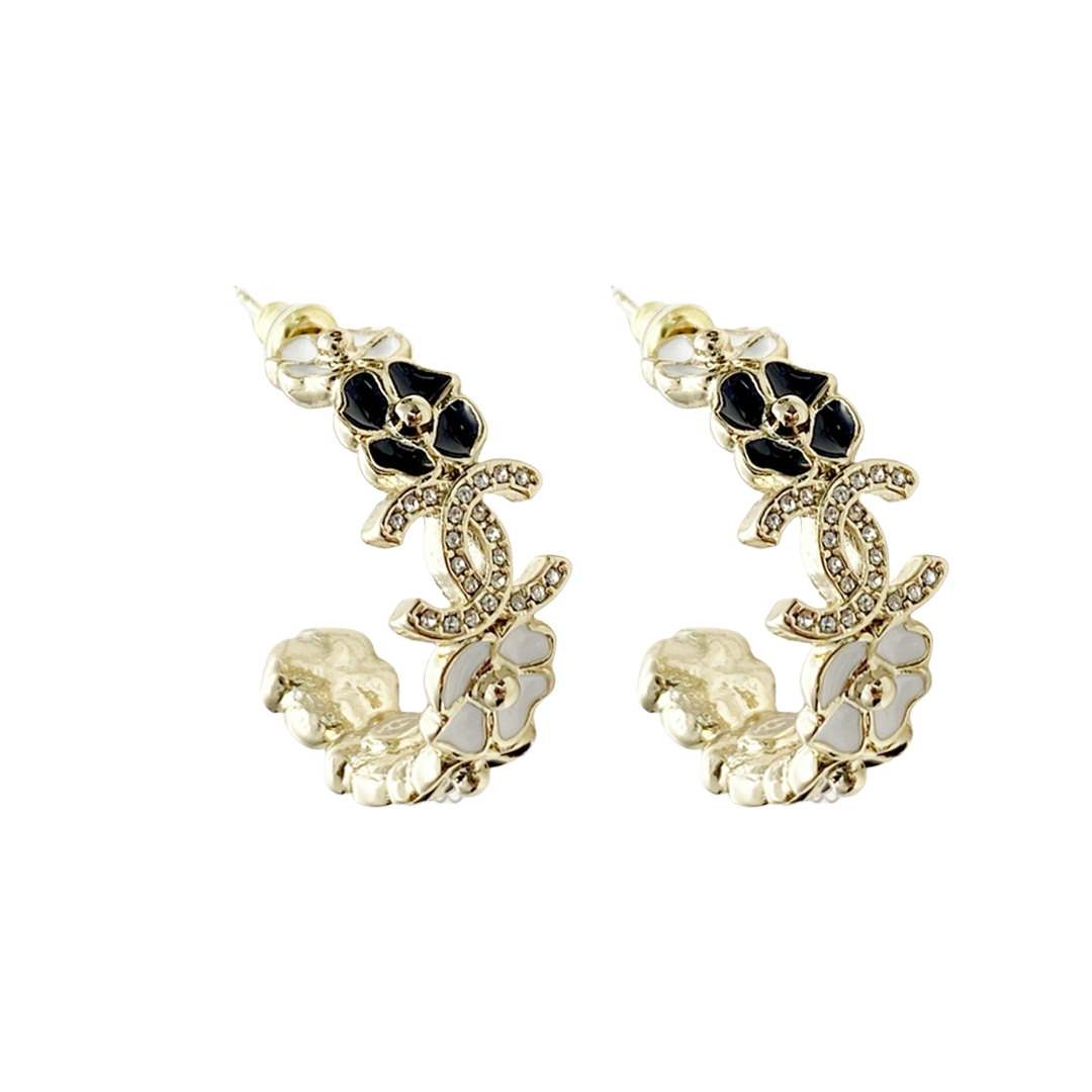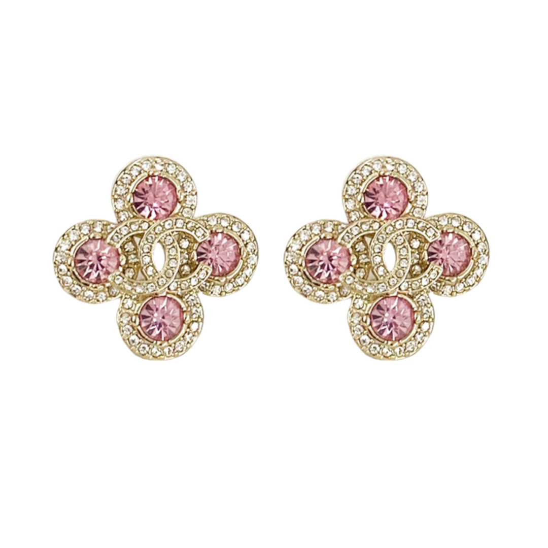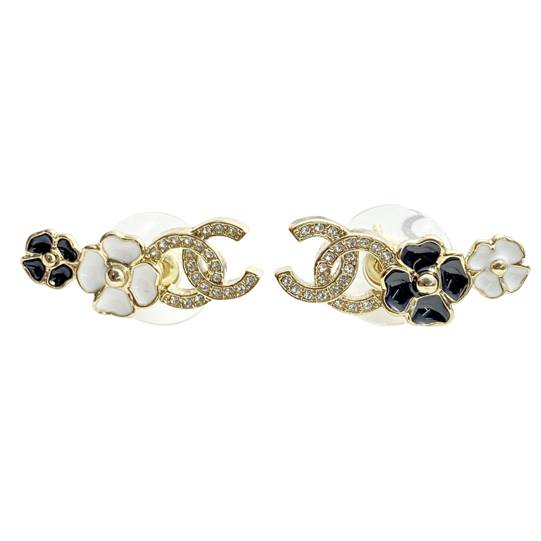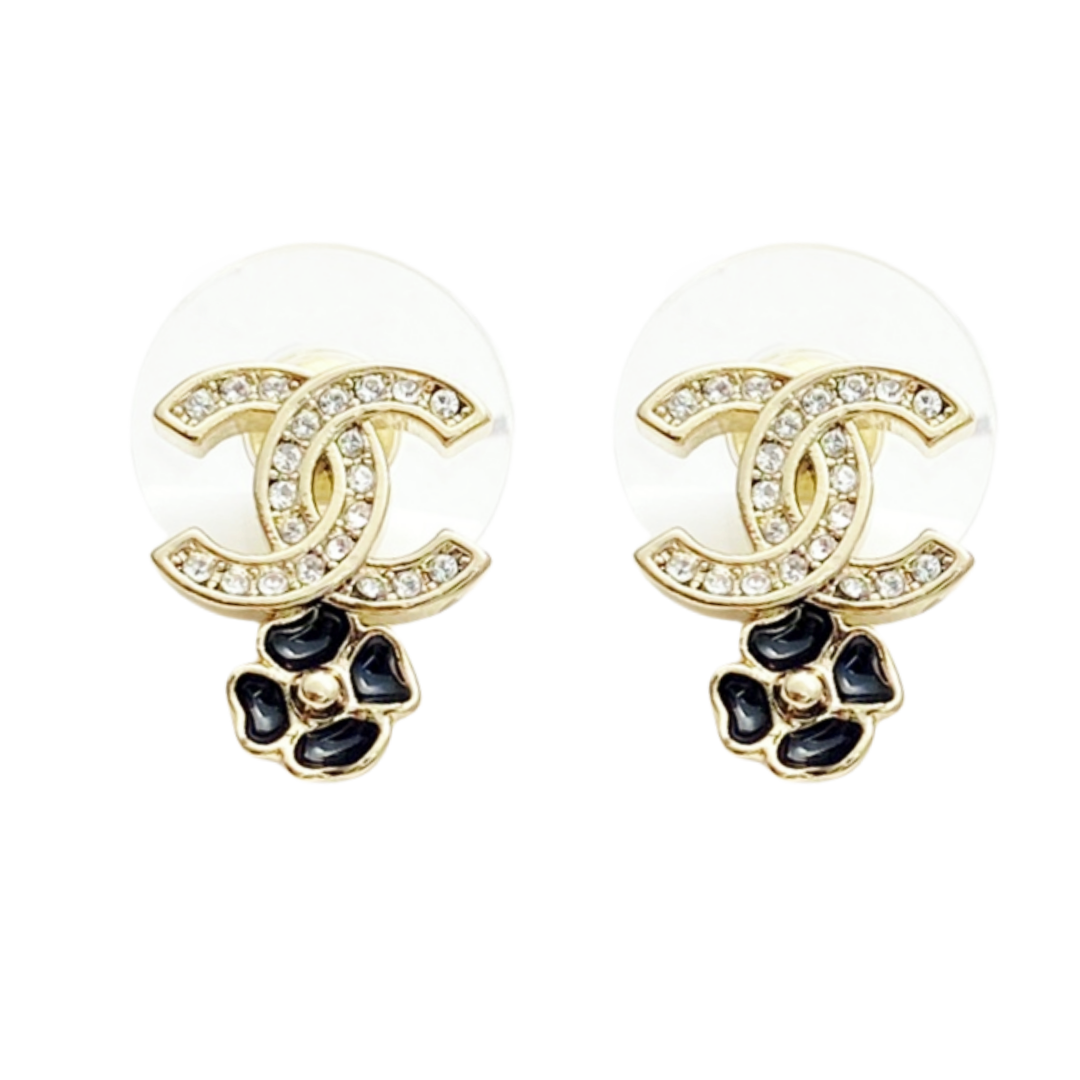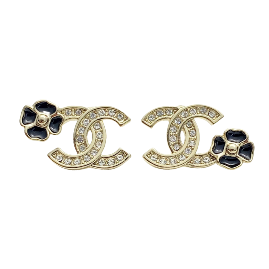 CCE259 Chanel 25P black enamel Four leaf clover crystal cc logo earrings