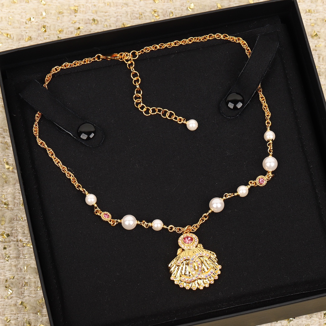 CCN576 23C Metal chain with pearl cc logo and black sun flower charm pendant necklace