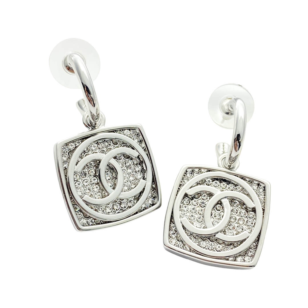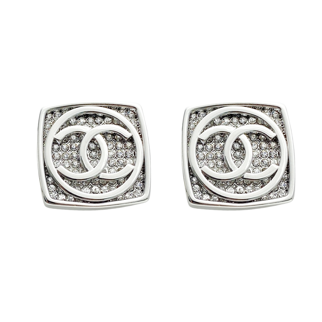 CCE147 White Gold plated crystal square stud earrings with cc logo