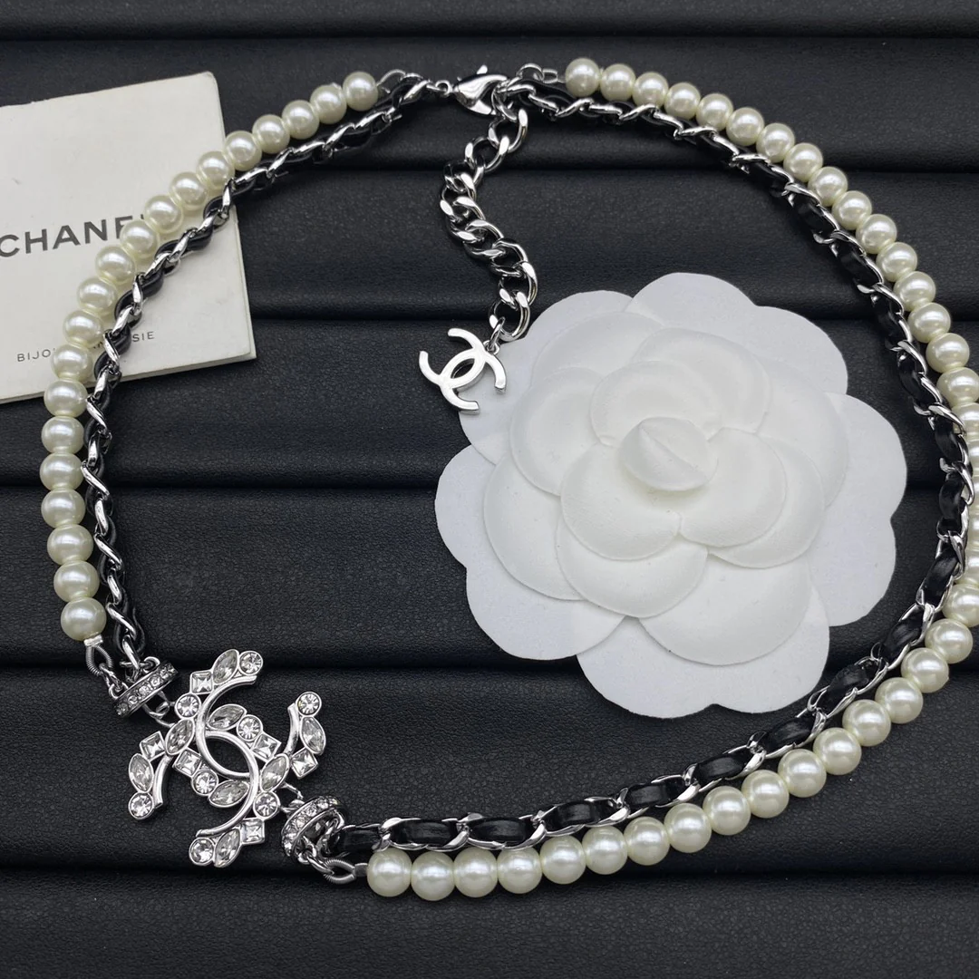 CCN203 Pearl And leather chain Double-deck CC Choker Necklace