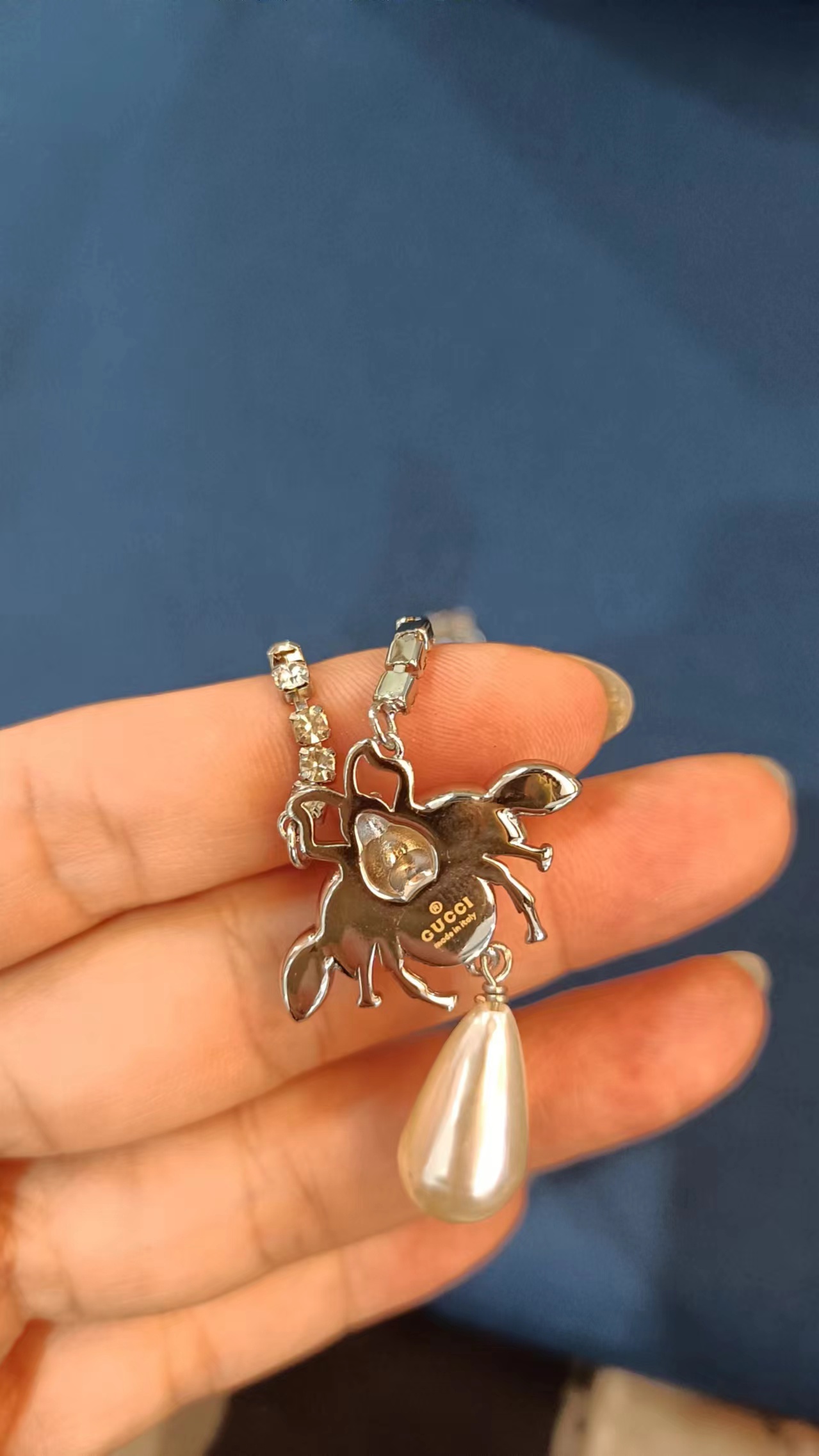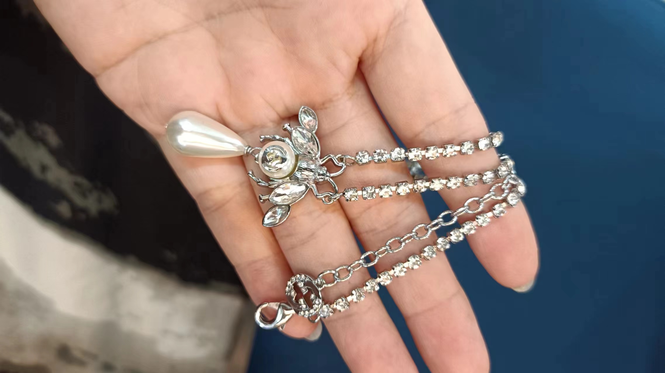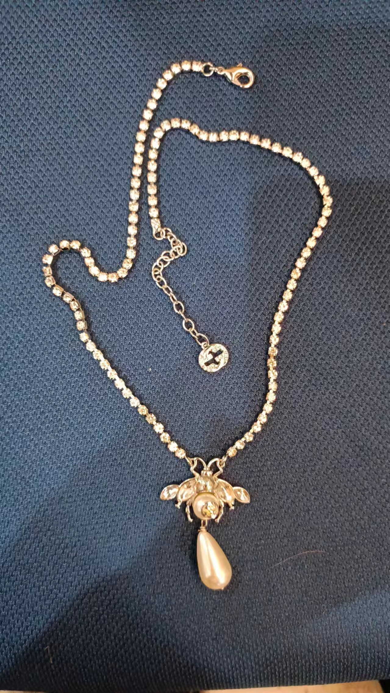 Gucci crystal diamond chain with bee pearl pendant necklace
