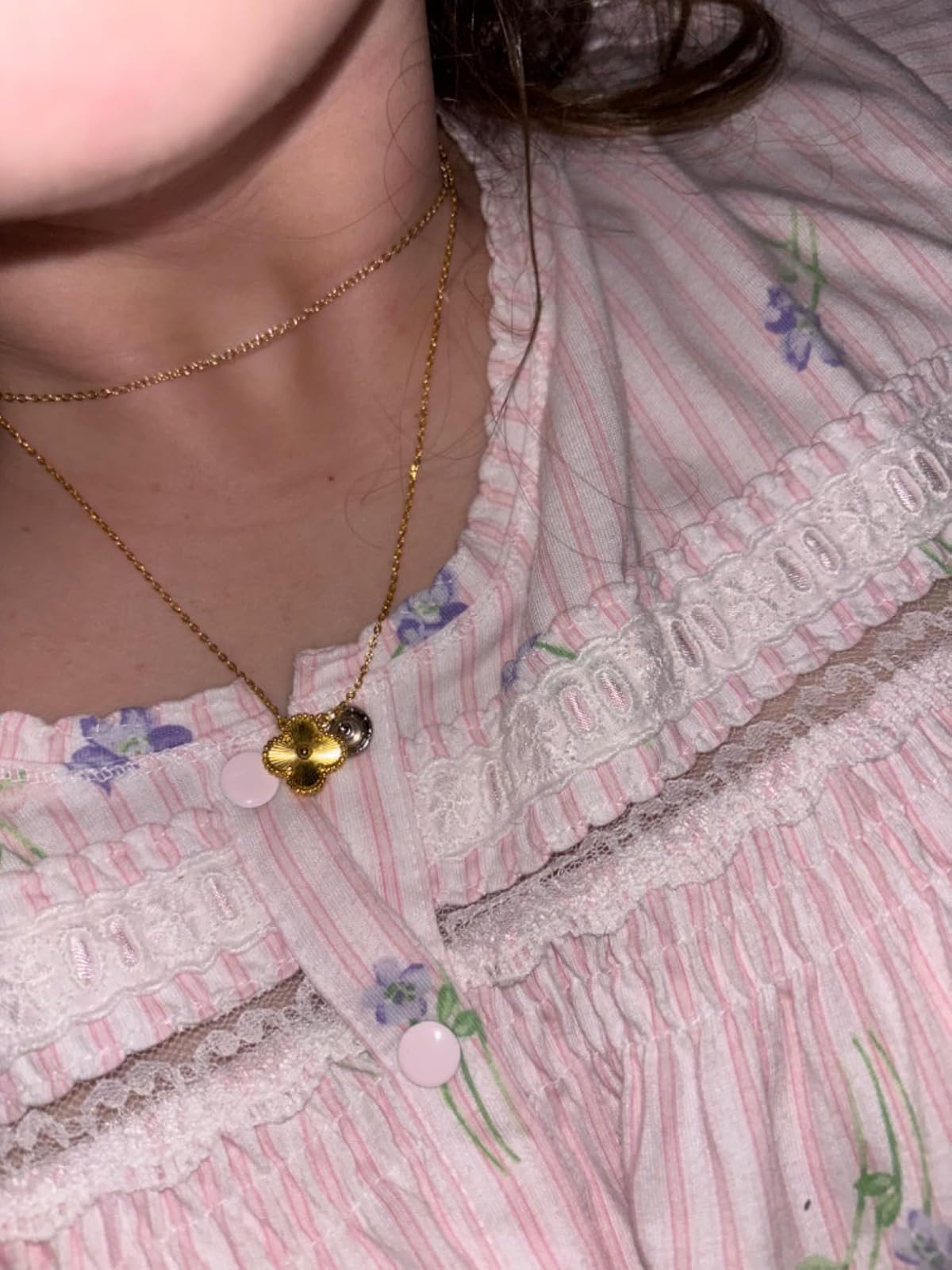 I'm absolutely pleased with this dainty clover necklace! The gold color is stunning - it's more of an 18-24k gold color than 14k, which gives it a luxurious feel. The four-leaf clover pendant is beautifully designed, with intricate details that catch the light. The necklace itself is delicate and dainty, making it perfect for everyday wear. I love that it's simple yet elegant, making it suitable for both teens and adults. It's a beautiful piece of jewelry that would make a lovely gift for mothers, daughters, or anyone who appreciates a touch of gold. The quality is exceptional, and the chain is sturdy and comfortable to wear. Overall, I'm so happy with this purchase - it's a lovely addition to my jewelry collection!